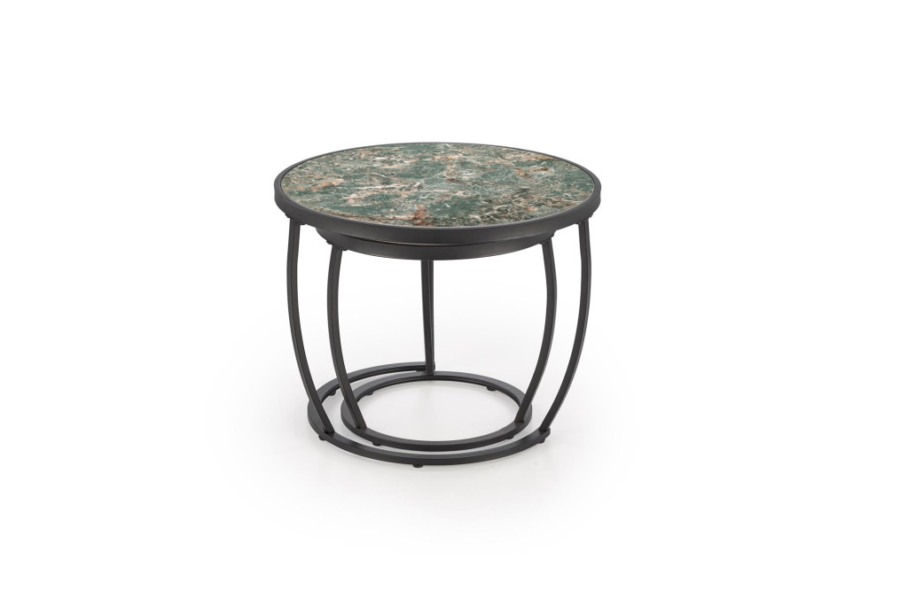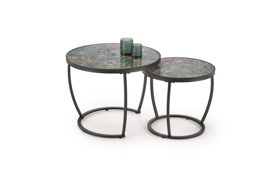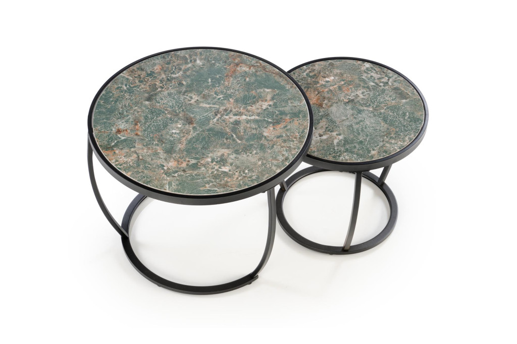 A lerakóasztal nem csupán egy kiegészítő, hanem a nappali, hálószoba vagy akár a terasz egyik központi eleme, amely összeköti a funkcionalitást a stílussal. Ez a 2 részes asztalszett fekete fém talppal és zöld rajzolatú márvány hatású lappal egyedülálló megjelenést kínál: könnyed, légies, mégis stabil és időtálló.Kifinomult design, ritka megoldás