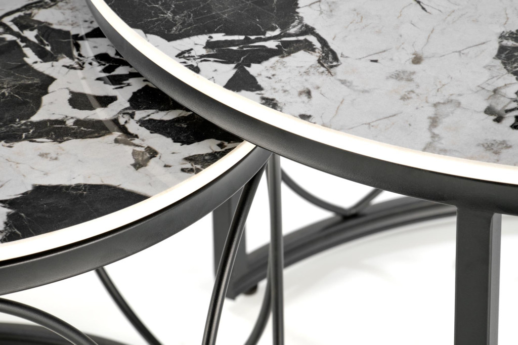 A fekete márvány hatású lap és a dekoratív fekete fém talp kontrasztja elegáns, kortárs hangulatot áraszt. Ez a párosítás bármely enteriőrbe tökéletesen illik – legyen szó modern, minimalista, industrial vagy skandináv stílusról. Az asztalok finom, letisztult formavilága miatt könnyedén kombinálhatók más bútorokkal és kiegészítőkkel.