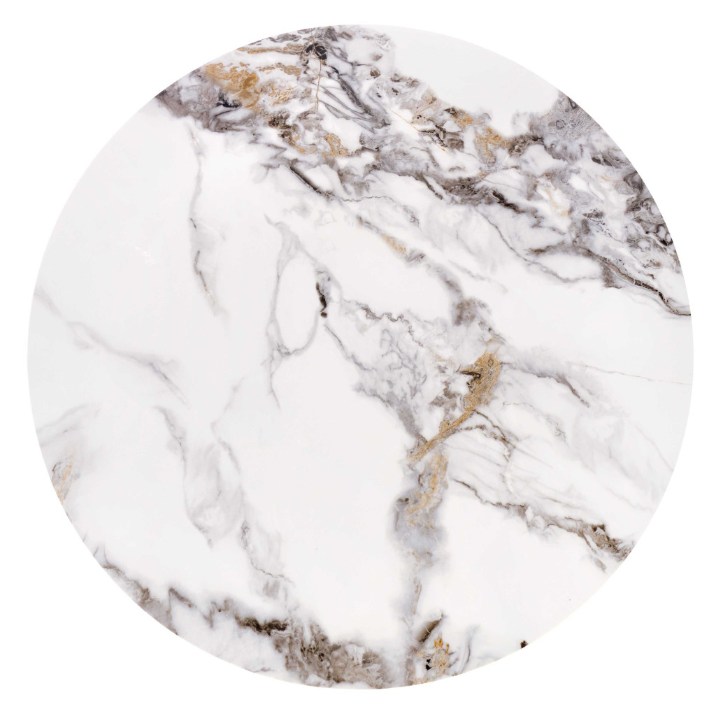 A masszív fém váz stabilitást és hosszú élettartamot garantál, míg a márvány hatású asztallap könnyen tisztítható és ellenáll a mindennapi használatnak. A fekete lábak modern megjelenést biztosítanak, miközben kecses, légies hatást keltenek.